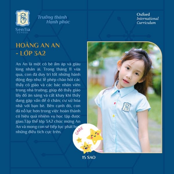 Trong tháng 11 vừa qua, chủ đề yêu thương và tri ân đã được các bạn học sinh tích cực hưởng ứng. Các bạn không chỉ tích cực thể hiện sự quan tâm, yêu thương bạn bè trong học tập và cuộc sống, mà còn có những hành động thiết thực giúp đỡ thầy cô giáo của mình. Mỗi hành động đẹp, các bạn học sinh sẽ nhận được 1 sticker Ngôi sao hy vọng. Dựa vào các tiêu chí sau đây, các thầy cô giáo cấp tiểu học đã chọn được 14 gương mặt tiêu biểu đến từ 14 tập thể lớp.