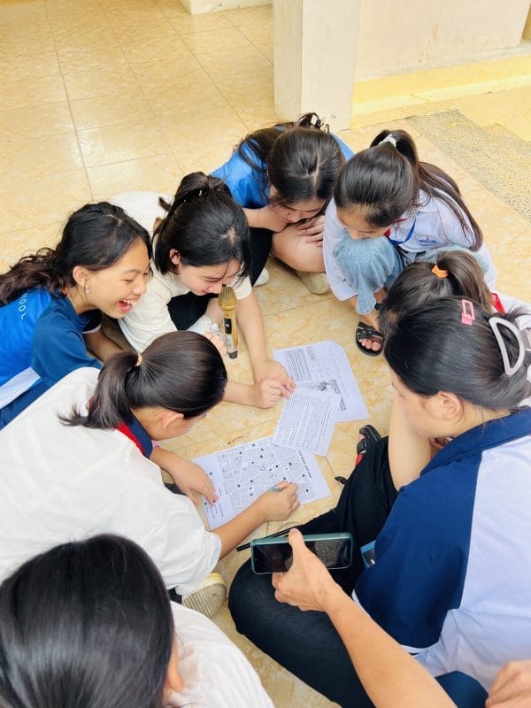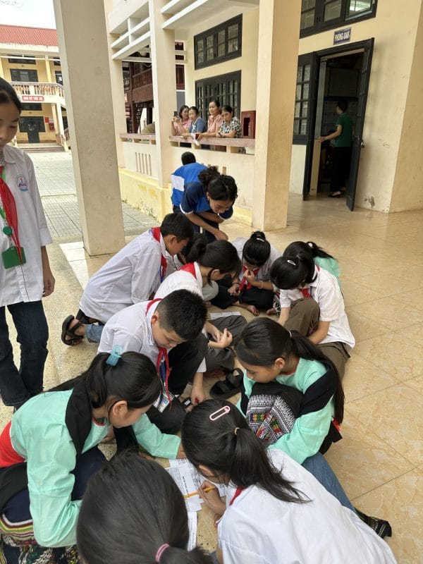 In the afternoon, after listening to the principal’s welcome speech, we participated in many interesting games. We divided five corners: Science, Fine Arts, English – Language, History – Geography, and Hiphop. The classes of Thuong Xuan school took turns visiting each corner that we had prepared during the past week. For example, in the science corner, children would participate in interesting experiments of putting mentos in coke, sticking a needle into a balloon, or folding an airplane. The two schools then played volleyball with each other very lively and enthusiastically.