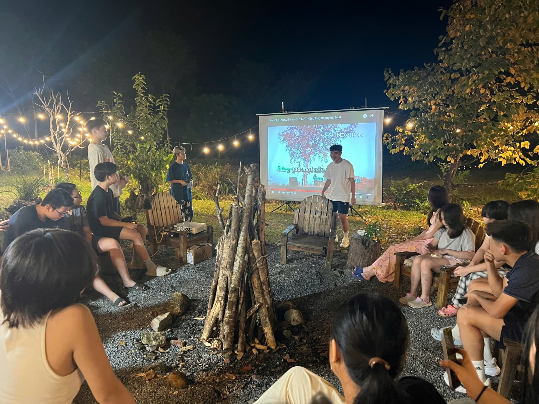 Đến tối, mọi người cùng quây quần bên nhau nướng đồ ăn và tham gia gala dinner. Không chỉ có các hoạt động văn nghệ để kết nối với nhau, chúng mình còn cùng nhau gửi lời chúc mừng sinh nhật sớm đến thầy Thảo – giáo viên dạy thể chất và gửi lời chúc đến các cô giáo, các bạn nữ nhân ngày Phụ nữ Việt Nam.