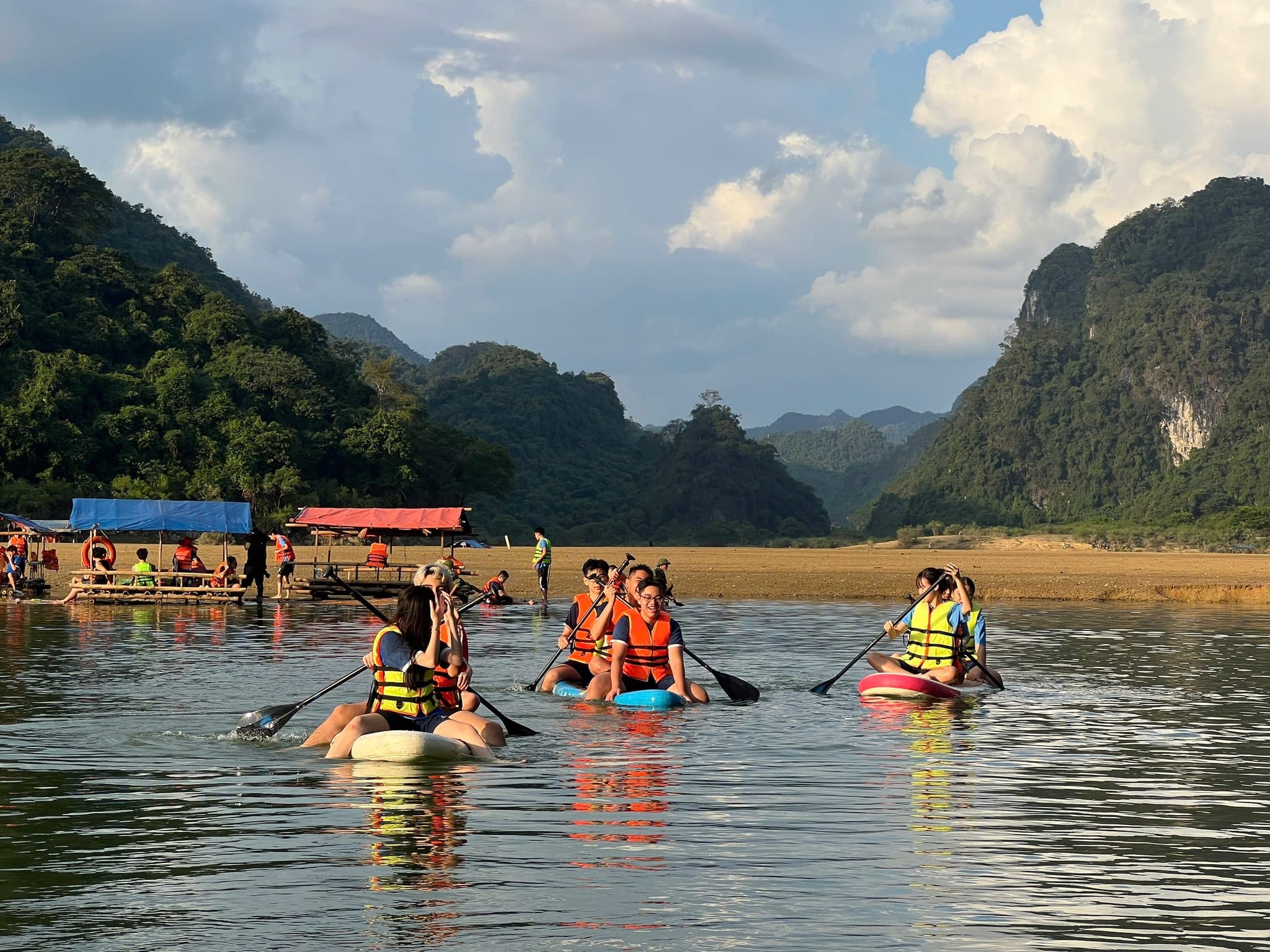 Dù xuất phát từ rất sớm, nhưng với tâm trạng hào hứng, mong chờ nên mọi người đều rất sôi nổi trò chuyện với nhau trong suốt 3 tiếng đi xe. Khi vừa đến địa điểm, các bạn học sinh đã nhanh chóng đi khám phá mọi ngóc ngách và lưu lại khoảnh khắc bằng những bức ảnh. Chúng mình có thời gian nghỉ ngơi và được thưởng thức đặc sản trên Lạng Sơn có tên “khâu nhục“ vào buổi trưa. Đến chiều, đoàn chia thành hai đội khác nhau song song để “lên rừng xuống biển”. Một đội sẽ đi bộ xuyên qua thác Khe Dầu và một đội chèo thuyền qua Thảo Nguyên Đồng Lâm. Chúng mình đều có khoảng thời gian vui vẻ, cùng nhau ngắm nhìn khung cảnh thiên nhiên và tận hưởng không gian trong lành.
