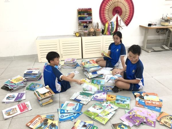Học sinh SenTian phân loại sách để gửi đến các bạn nhỏ có hoàn cảnh khó khăn
