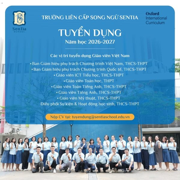 TRƯỜNG LIÊN CẤP SENTIA TUYỂN DỤNG CÁC VỊ TRÍ GIÁO VIÊN, BAN GIÁM HIỆU NĂM HỌC 2026-2027 Trường Tiểu học, Trung học cơ sở & Trung học phổ thông SenTia, thành viên thuộc tập đoàn giáo dục Taylor’s Education Group, Nhà trường hoạt động dựa trên triết lý “Trưởng thành…